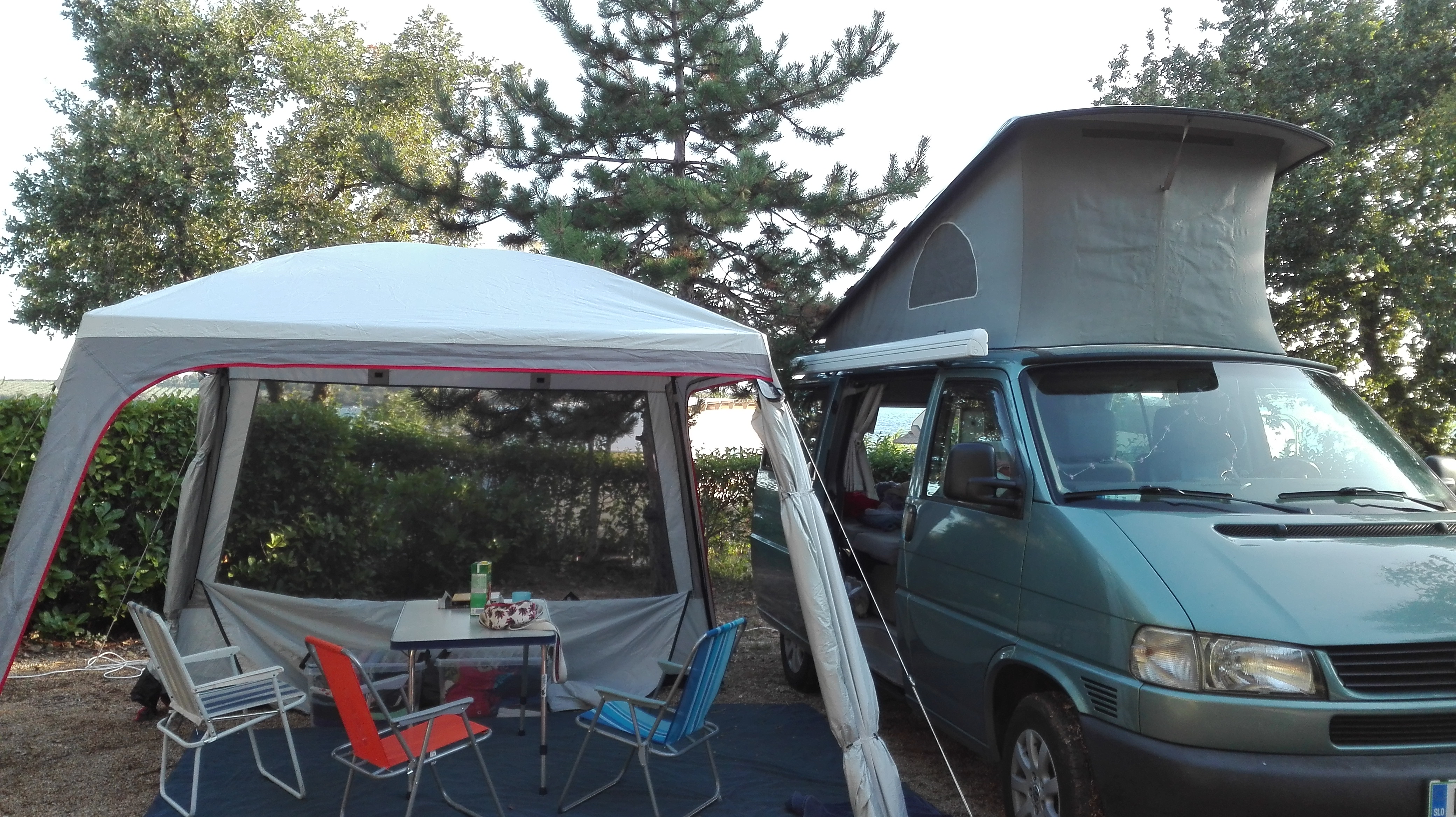 Začelo se je super. Parcela blizu kopalnic, ravna in obrnili smo se stran od vetra, da nas ne bi preveč zeblo, ko bomo sedeli zunaj. Kopalnica resnično čista in moji obiski so postajali redkejši. Potem pa naenkrat postane nebo temno, po celem kampu se zasliši zabijanje klinov in veter postane tako močan, da smo vsi 4 (tudi pes) zlezli na spodnjo posteljo Olive. In se stiskali. Skoraj dobesedno. Postelja je namreč dolga 190 in široka 110 (če ne še manj). Zelo malo prostora za nas vse. Smo mislili. V resnici pa je bil to za nas prelomni trenutek. Celotno obdobje nevihte smo si pripovedovali razne zgodbe, se nasmejali, da nas je vse trebuh bolel in odigrali kar nekaj partij kart. Ugotovili, da moramo predale Olive napolnit z raznimi družabnimi igrami, ker se je izkazalo, da nas to totalno zabava. In da smo srečni, če se stiskamo na tako majhnem prostoru.