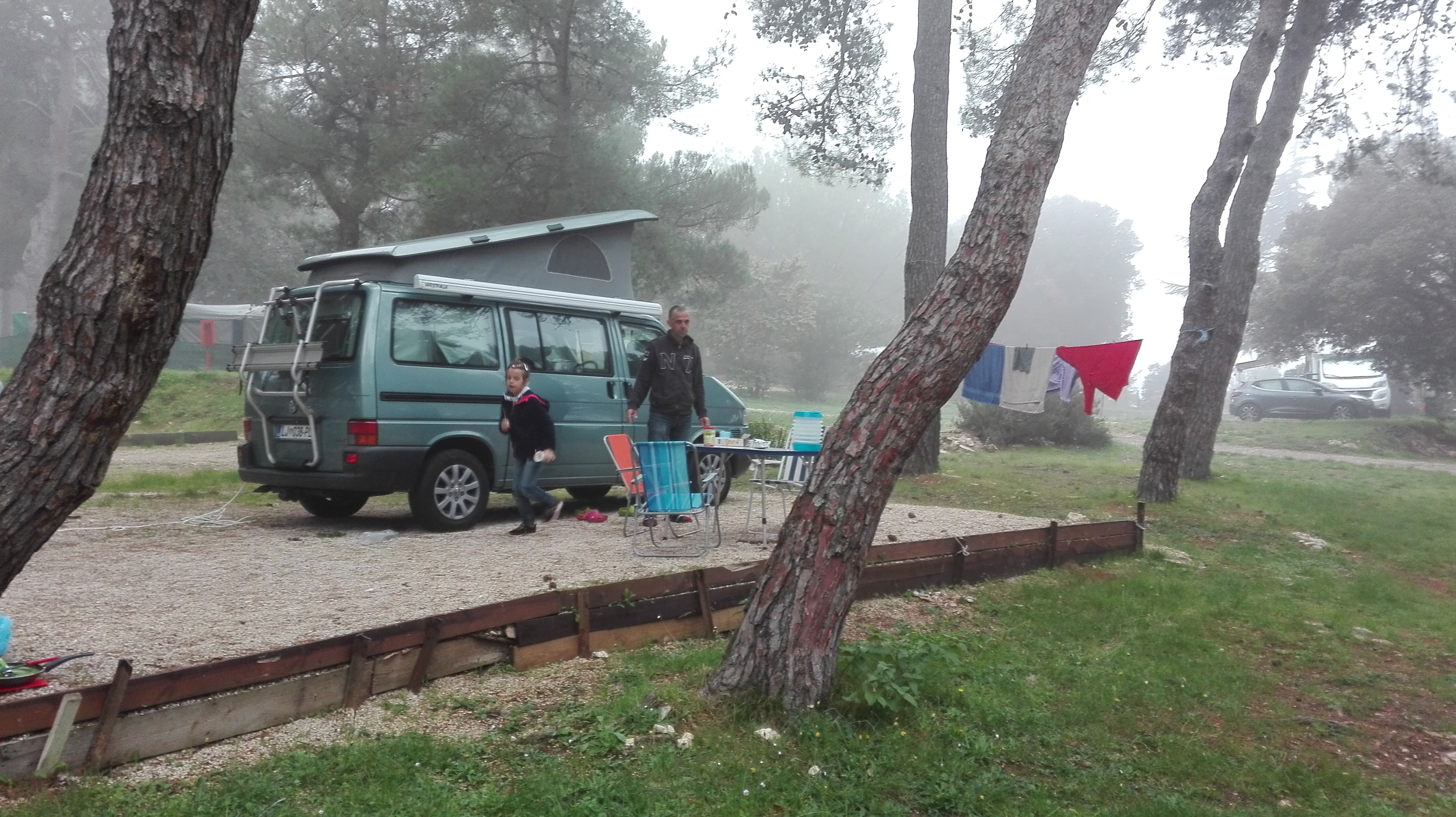 Jesen je bila leta 2017 res kar hladna. Mi pa novo Olivo. Ne moremo vendar ostati doma in je samo gledati. Zato smo kupili posebno izolacijo strešne postelje in gretje (Oliva ima že vgrajeno ogrevanje) in odšli v kamp Brioni pri Fažani. Izolacija mogoče res ni poceni, ampak se nam je pa zaradi nje sezona spanja v zgornji postelji podaljšala za kar nekaj mesecev. Je tudi zelo enostavna za uporabo.