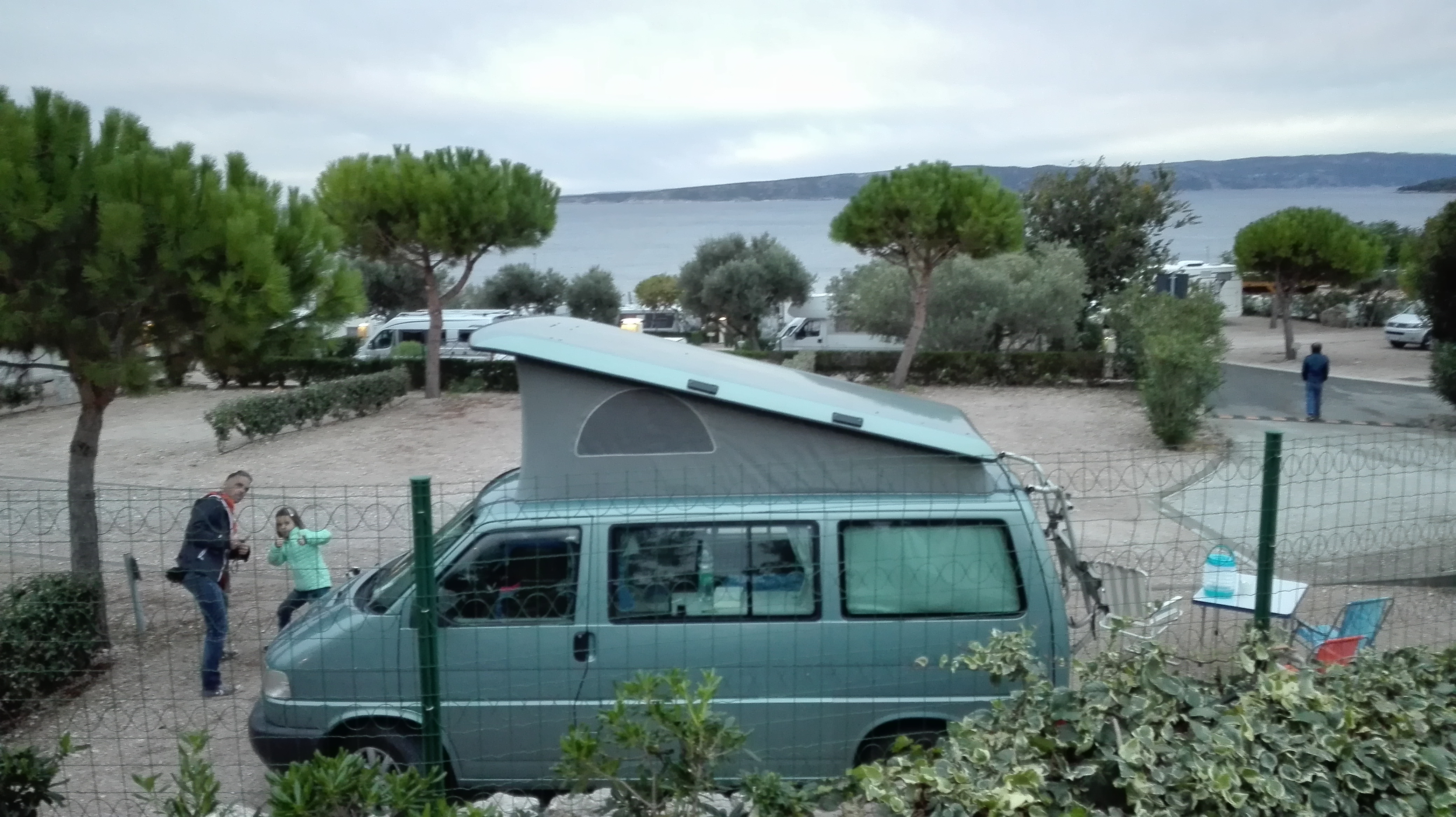 Pa se v petek popoldne pripeljemo na Krk, nato v Krk in komaj najdemo kamp. Pa Krk kar dobro poznamo. Na vhodu nas ustavi prijazni vratar, ki nima svoje hiške ob rampi, kot jo imajo popolnoma vsi kampi. Ne, tukaj mora cel dan stati, pa če dežuje, je vroče ali pa padajo prekle. Hm?