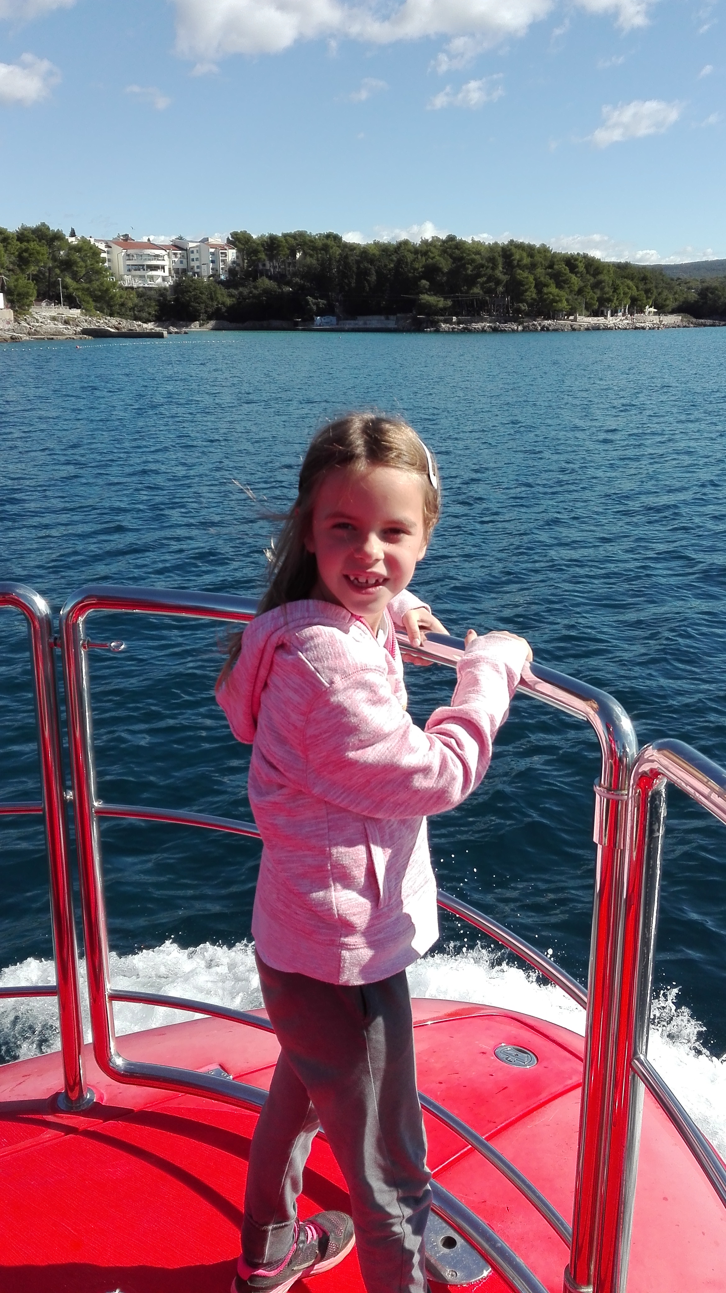 Odkrijemo sprehajalno pot iz kampa do mesta Krk. Čudovita je. Žal ni primerna za družine z vozički, ker nima ravne podlage. Zato predlagam, da vsi, ki imate manjše otroke, naj vam očki nosijo voziček, vi pa otroka v naročje. Saj ni dolga pot. Kmalu pa se tudi razširi in otroka lahko odločite nazaj v voziček in upate, da bo čimprej zaspal, da si lahko v mestu na obali privoščite kavo v miru. Vsaj jaz sem si tega vedno želela, ko je bila Ema še manjša – kava v miru.