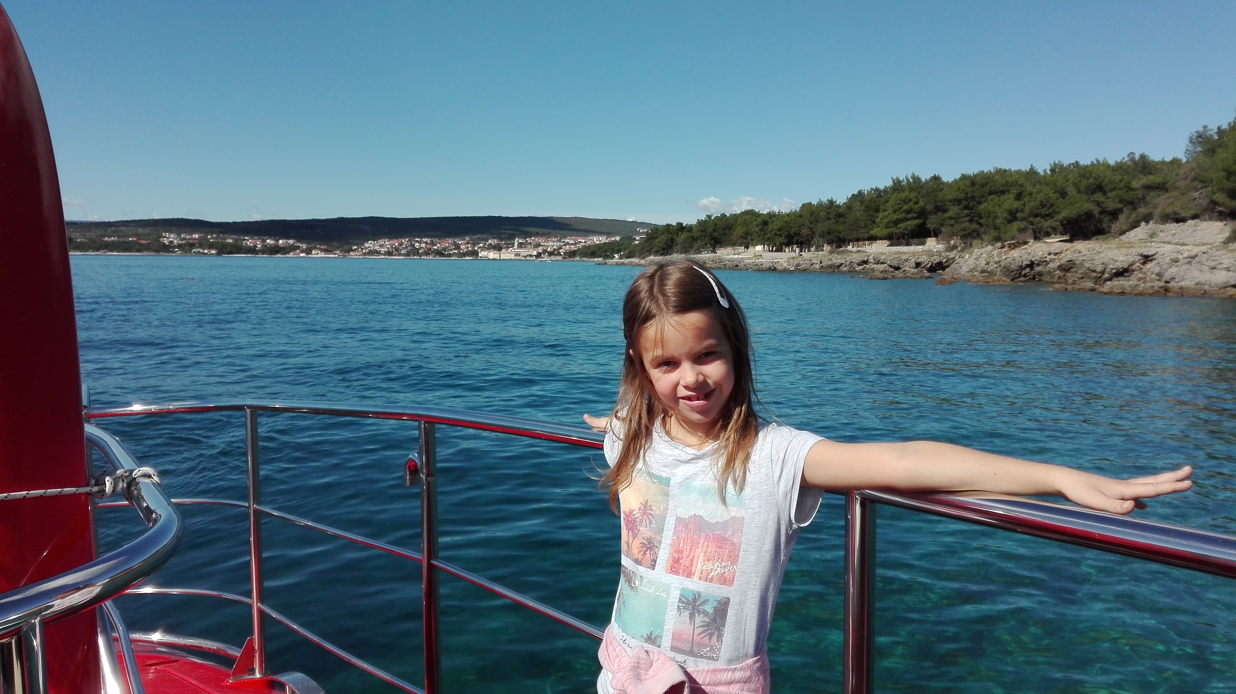 Mesto Krk je septembra prijetno prazno. Sploh po dežju. In ker nimamo več otroka v vozičku v miru spijemo kavo na obali. In pred nami rdeča podmornica. Že od nekdaj me je mikala ta tipična turistična ponudba. Ker mi je popolnoma jasno, da v Jadranskem morju ni nič pametnega za videti pod morsko gladino, si zmislim, da si Ema to res zelo želi in da se žrtvujem in grem pač z njo. Trik uspe. Rok gre s psom nazaj v kamp po Olivo, midve pa na rdečo podmornico.