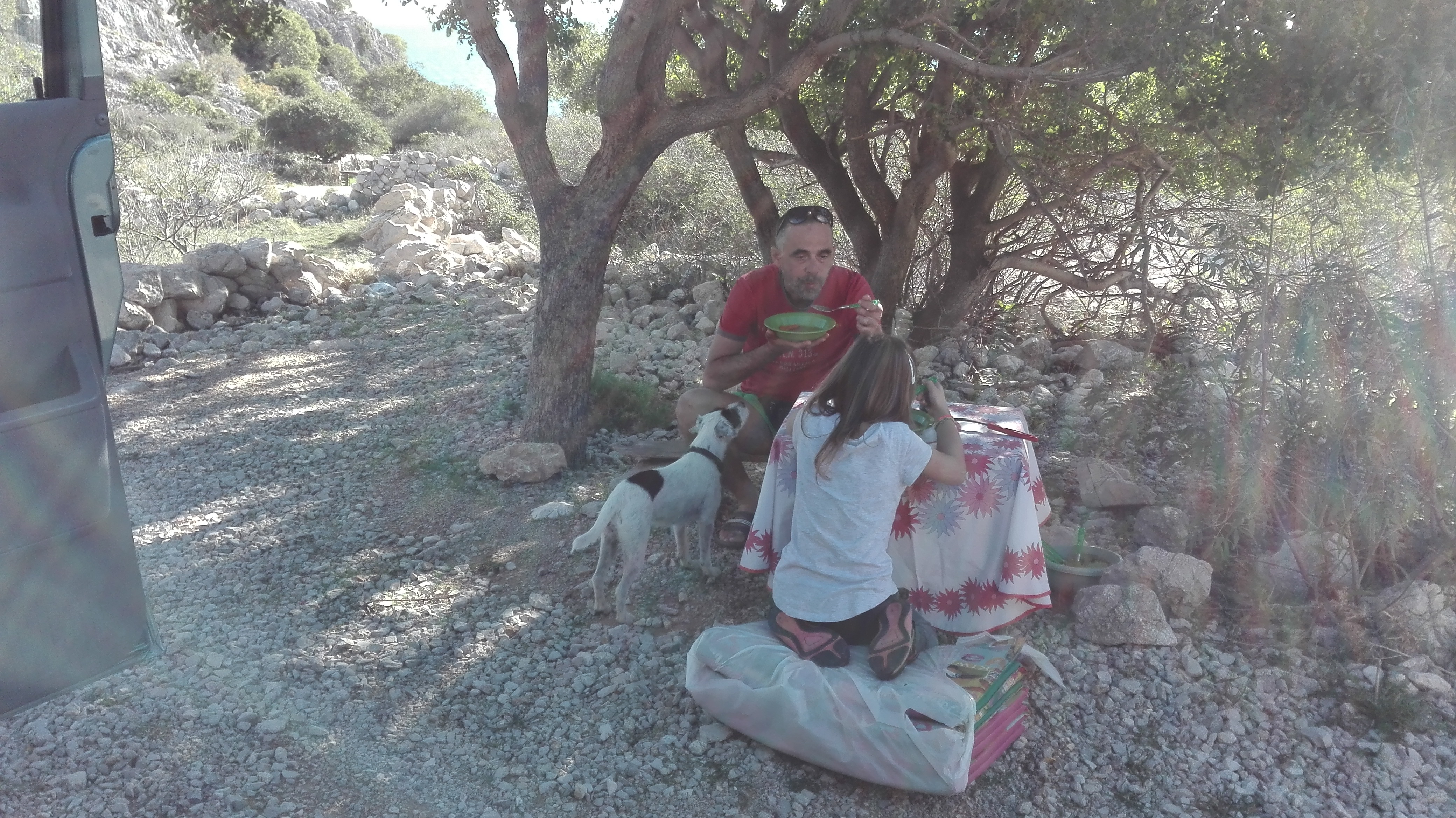 Prednost vandranja z Olivo je v tem, da ves čas, vse kar imaš, nosiš s seboj. Te zebe? Ni problema, v Olivi imaš vso svojo garderobo. Si lačen? Ni problema, ustavimo se še naprej od Stare baške, nekoliko nad prečudovito plažo z belimi kamenčki, v senci oljk, kjer že stoji miza nekega pastirja. Odpremo streho, da si omogočimo stojno višino v kuhinji, iz hladilnika vzamemo zmrznjeno govejo juhico (smo le Slovenci), zmrznjen haše in skuhamo špagete. Iz omare potegnemo prt in sedimo na blazinah, hlodih ali pa na vhodu v Olivo. In s pogledom na morje. In z vonjem morja. In toplino sonca. Čudovito!! Nepozabno. Vedno sem si želela jesti sredi narave. In to mi Oliva omogoča. To je tisti pravi #vanlife. In v takih trenutkih smo srečni in postanemo močnejši kot družina. Verjemite, da jesti kosilo skoraj na kolenih in si podajati solato naokoli ni enostavno in zabavno, če tega ne počneš z ljubeznijo. In mi smo ta ljubezen. Zaradi Olive.