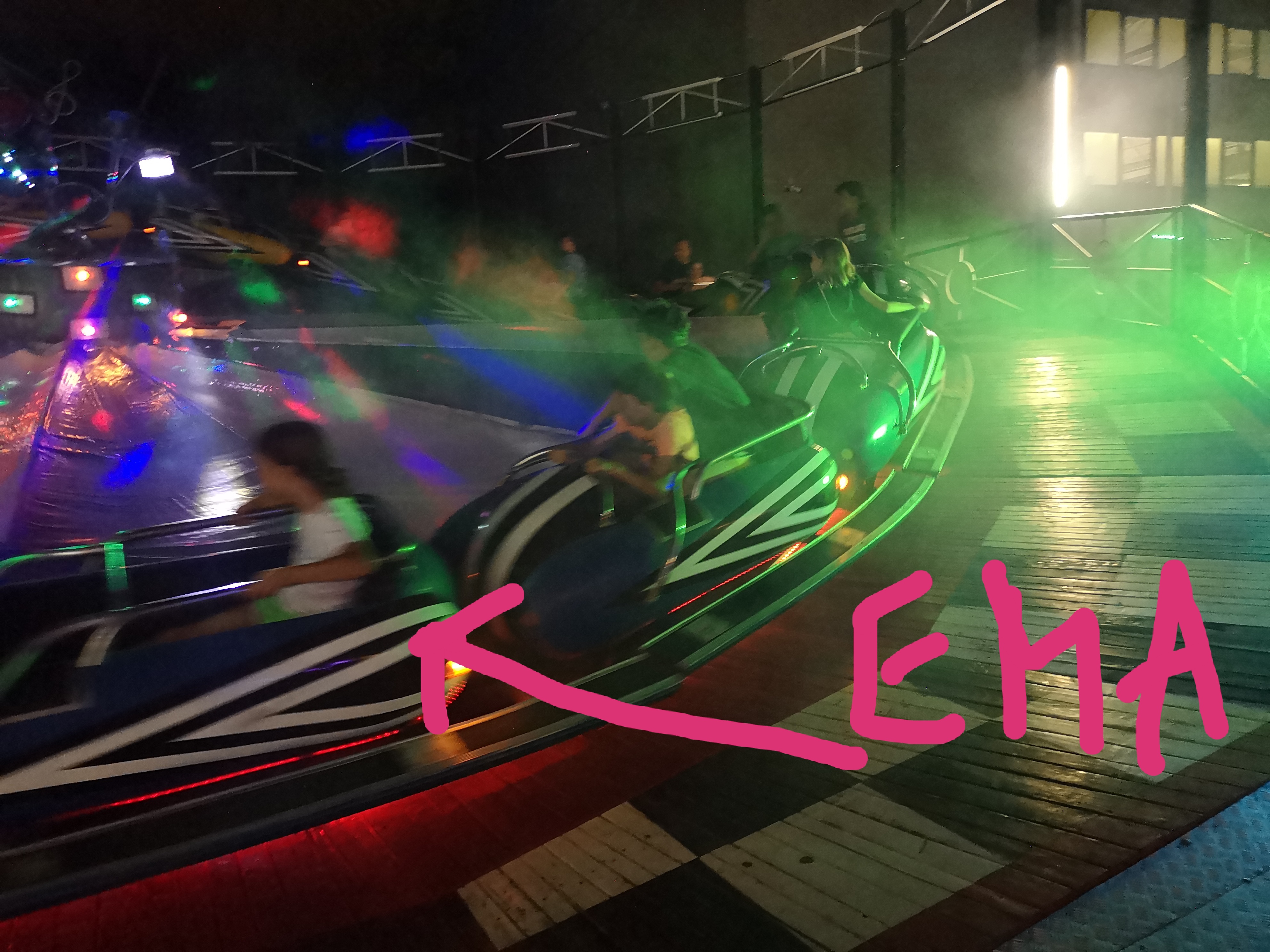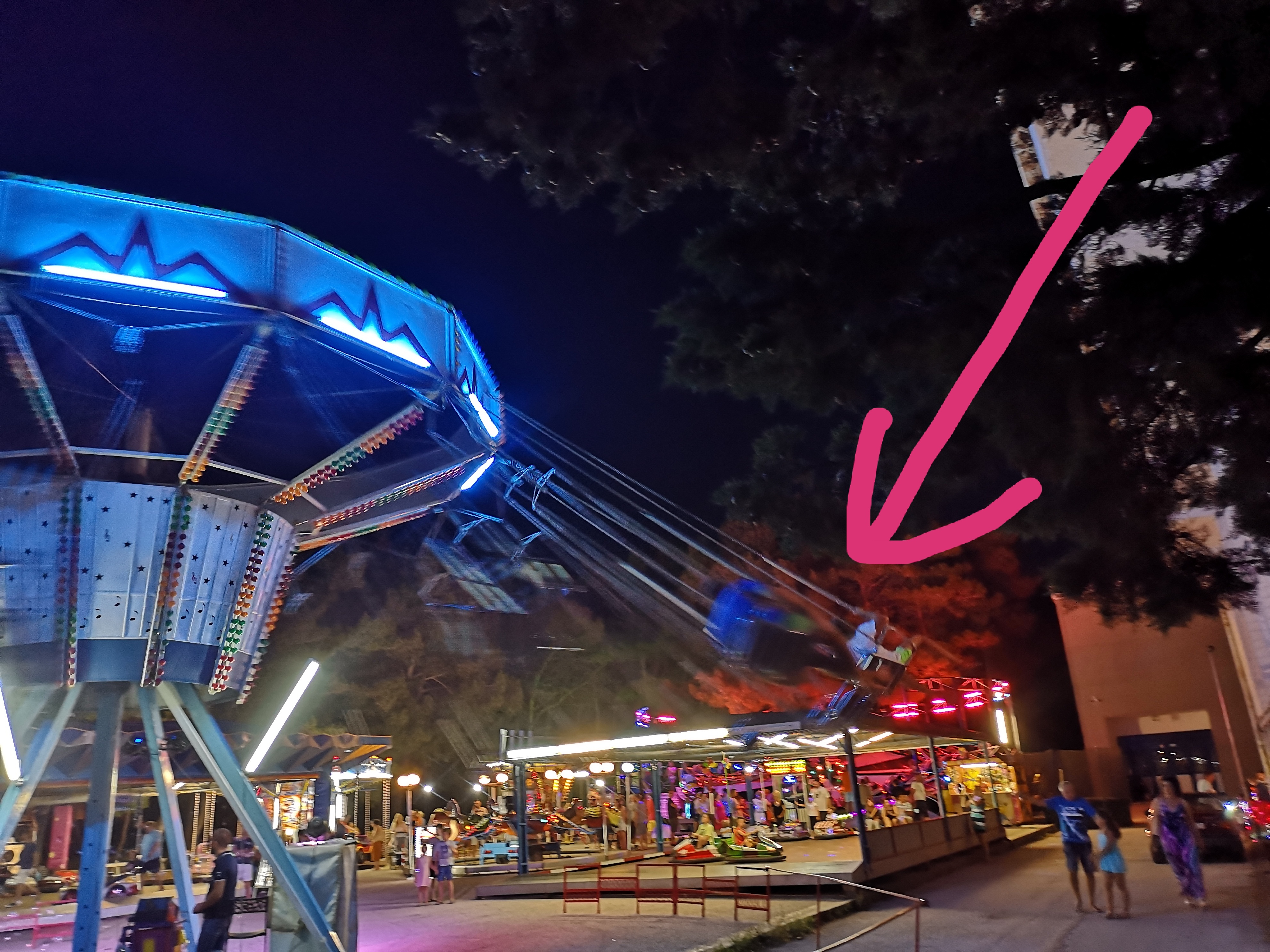 Zvečer se odpravimo v luna park. Ujamemo vlakec, ki pelje iz kampa v Novaljo in nas zapelje del poti. Ema v luna parku maksimalno uživa. Meni je slabo že samo od tega, ko gledam, kako se vrti.