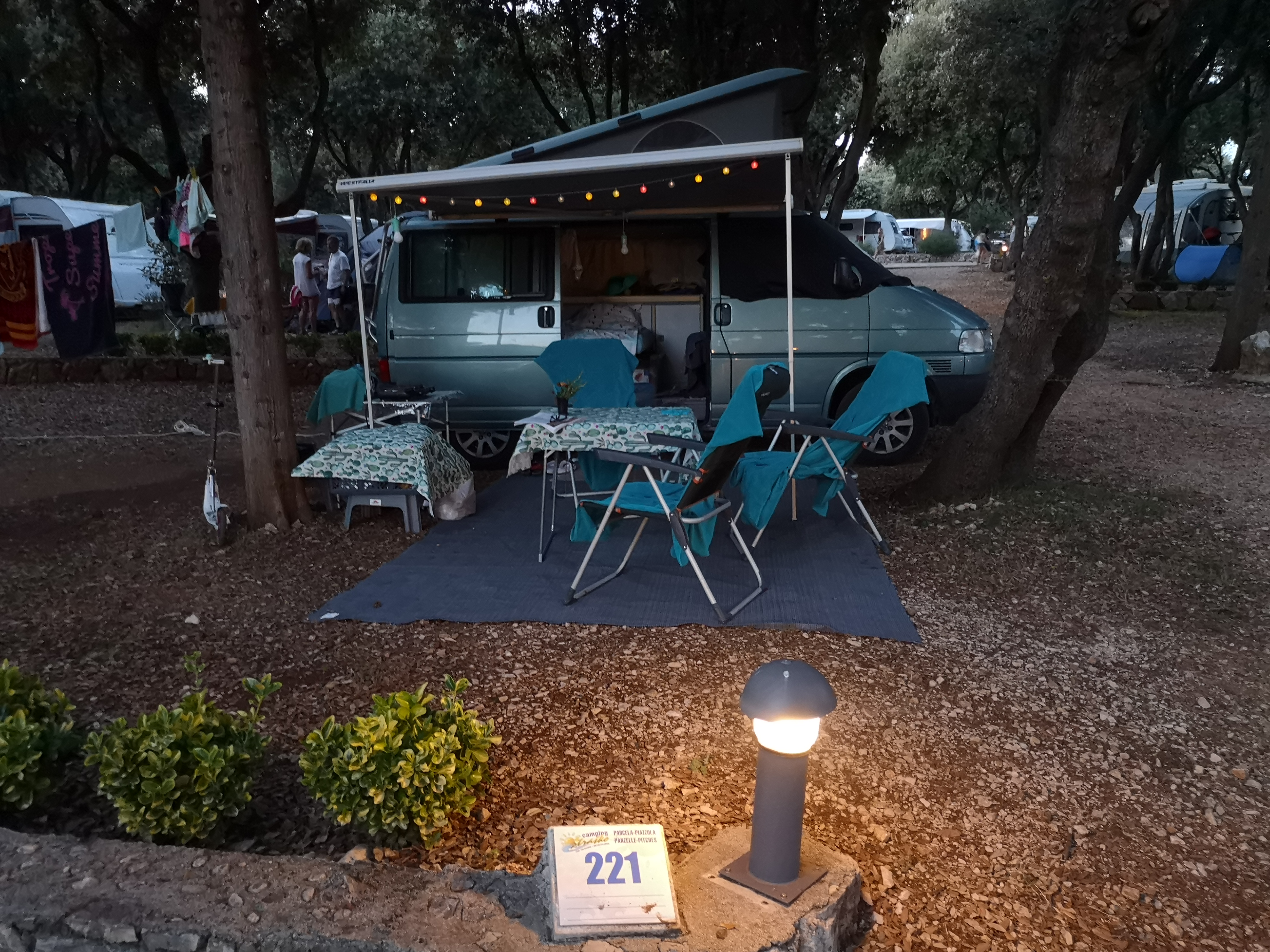 Kilometer ali dva in že smo v kampu. Na recepciji doživimo enega najbolj prijaznih sprejemov . Takoj nam povedo, da je kampiranje s kartico avtokampi.si cenejše. Na zemljevidu nam označijo nekaj prostih parcel in že se odpravimo proti tisti, ki je najbližje morju. Je malo manjša parcela, stoji poleg pekarne in restavracije, ima pogled na morje in je zelo blizu plaže. Idealna, ampak nima pa nobenega debla, na katerega bi lahko obesili vrv za sušenje perila.