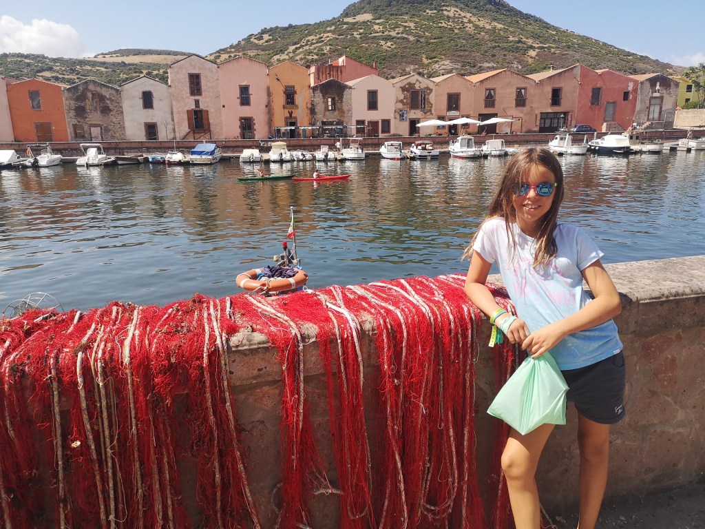 Prvi postanek je bil v kraju Bosa. Za Boso mi je povedala prijateljica, ki ima očitno neke posebne spomine na ta kraj, saj je nanjo naredil večji vtis, kot name. Spili smo našo kavo z rogljički, se sprehodili po kraju in Emi kupili masko za potapljanje. Kraj je znamenit po pisanih hišicah na hribu, nad katerim kraljuje grad. Ima menda tudi čudovito plažo, a mi smo krenili dalje.