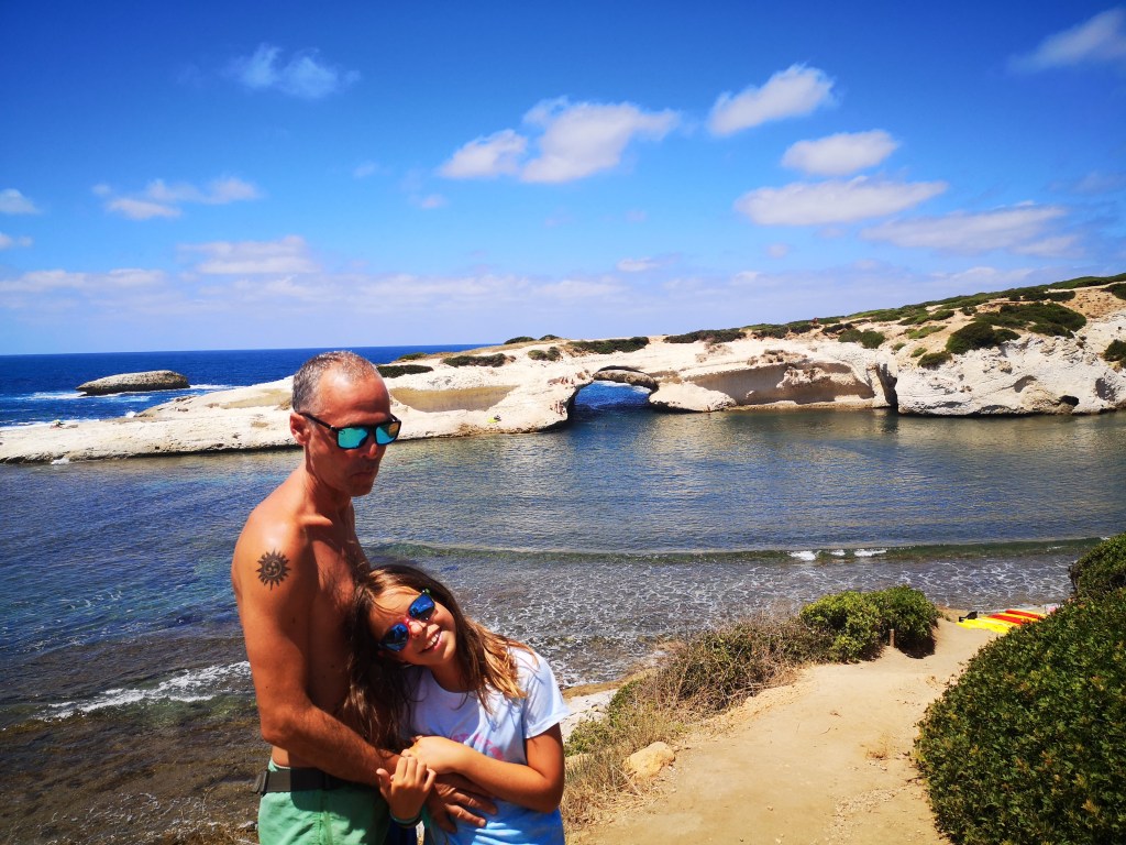 Ogledali smo si naravni most na obali. Sardinija je z geološkega vidika zelo pestra in zato zanimiva. Zaradi pojava “preperevanje” so se oblikovale različne oblike skal, o katerih govorim na začetku bloga. Na severozahodu pa prevladujejo sedimentne kamenine (peščenjaki, glinavci in apnenci). Most v S’Archittu je nastal zaradi pokrova, ki je vulkanskega izvora (odporen na preperavanja), erozija kamnin pod njim pa je povzročila čudovito naravno znamenitost. Most je visok 17 m, uporabljajo pa ga tudi za prvenstva v skokih v globino. Zvečer je pot do njega osvetljena. Če imate čas, vam svetujem, da se tam vržete tudi v morje, ker je obala čudovita. Prijateljica pa mi je povedala, da imajo tudi dobre pice v bližnji piceriji.