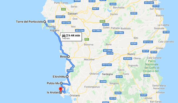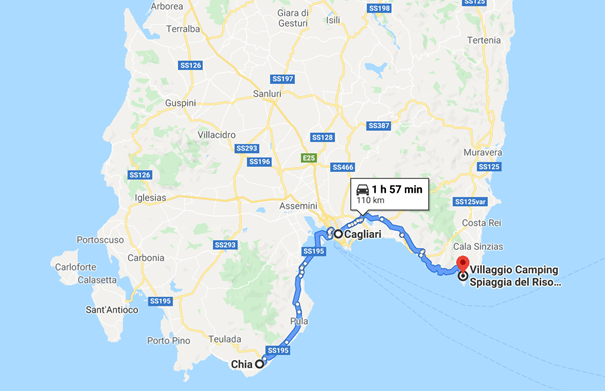 Gremo naprej. Razočarani. V navigacijo vpišem Sant’Antioco in po neštetih krožiščih se pripeljemo na otok. Lačni se ustavimo v borovem parku in pojemo sendviče. Nato dalje, navigacija nas pelje skozi mesto, še naprej in naprej in po stranskih ulicah že ven iz mesta in dalje. Smo pač bili prepričani, da to ni bilo glavno mesto otoka in da je nekje sredi otoka še eno. A, da do tja pelje taka ozka pot, kjer se dva skoraj ne moreta srečati in pa dejstvo, da nismo srečali niti enega avta, se nam je pa le počasi zdelo malo čudno. In ko navigacije reče, da smo na cilju, ugotovimo, da smo sredi ničesar. Telefon brez signala, seveda. Hja, to se zgodi, če v navigacijo vpišeš ime otoka in brez očal ne vidiš, da nisi izbral mesta. Smo se dobro nasmejali in pot vseeno nadaljevali, saj se nam je zdelo, da mora nekam peljati. Počasi smo našli civilizacijo in glavno cesto, ter se vrnili nazaj do tistega prvega mesta.