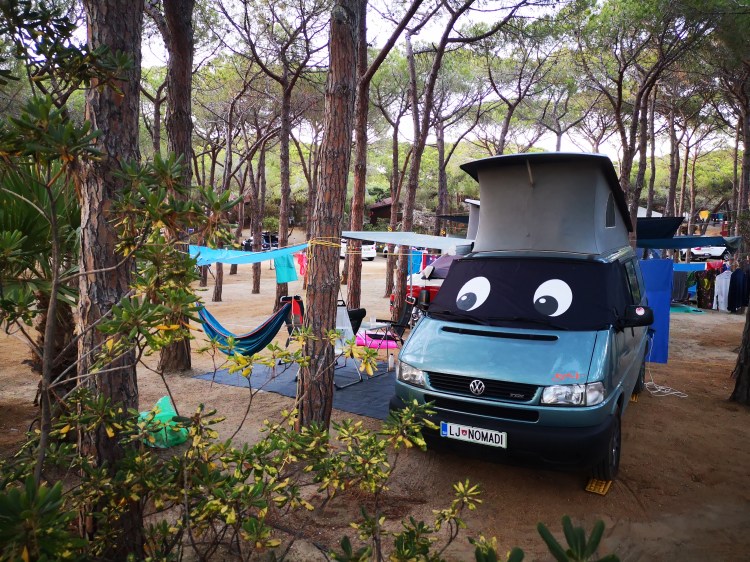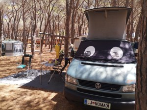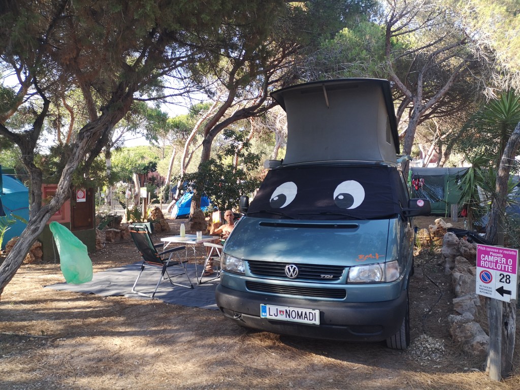 Kamp je sicer lep, senčen, prazen, a odnos na recepciji vse skupaj malo pokvari. Na vsak način me je hotela prepričati, da skrivam v Olivi še enega otroka, ki ga nočem prijaviti. Pa sem ji rekla, da naj stopi iz svojega kotička in pride na ogled Olive… pa se ni odločila. Izberemo parcelo, za katero se po 5 min izkaže, da je edina z malo manj sence, zato se takoj že selimo na sosednjo. Ravno dobro vse postavimo, ko mimo nas pride moja sodelavka Sanja. Kakšno presenečenje!!! Seveda se je totalno razveselim in ne mine dolgo, ko že sedimo pri njej na pivu. Otroci so našli svojo družbo, midva pa svojo. Idealno. Za drugi dan takoj splaniramo piknik. Pridobiva nekaj dobrih nasvetov in sicer kar se tiče prihodnjih kampov, o pivu Ichnusa, žetonih za tuš in neprecenljivi namig za najboljši čokoladni namaz: Panne di stella ali “Stella Nutela”, kot ji rečejo otroci od Sanje. Čist hud namaz!!