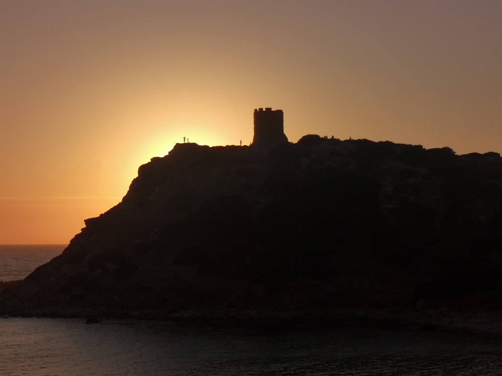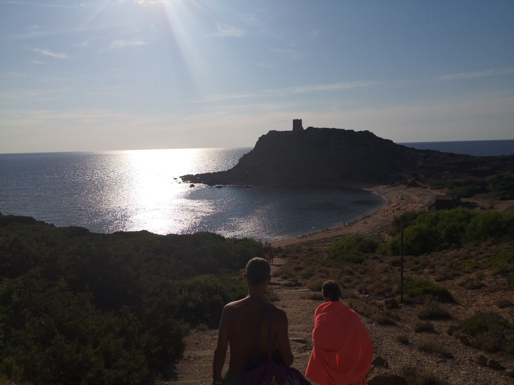 Nadaljujemo ob obali, čez prelaz, do kraja Chia. Najdemo kamp in primerno parcelo. V tem kampu je bila plaža, ki je bila meni na celem otoku najbolj všeč. Mali kamenčki in voda, ki hitro postane globoka. Ponovno v zalivu, kjer na desni strani kraljuje obrambni stolp.