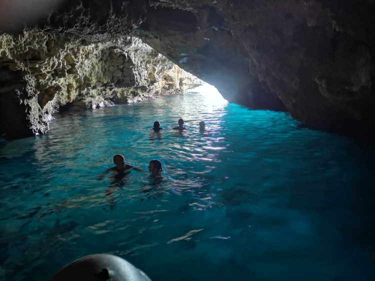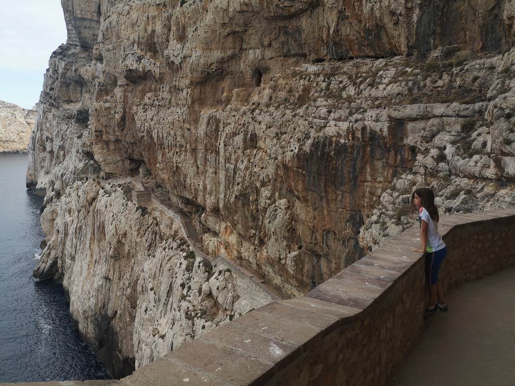 Kamp je blizu Neptunove jame, ki smo jo po priporočilu gospe v kampu, obiskali “zgodaj” zjutraj. Ob 8.30 smo bili že na vrhu 654 stopnic, po katerih se spustiš v jamo. Zakaj tako zgodaj? Ker so kasneje stopnice na soncu in če vam že spust ne bi delal večjih težav, vam ob vrnitvi sonce ne bi bilo v veliko veselje.