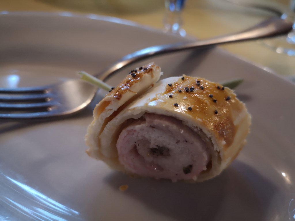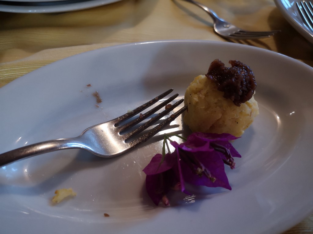 Večerja je bila odlična. Vnaprej imajo pripravljena dva menija: mesni in vegetarijanski. Vzameva vsakega po enega, Ema bo že pri naju jedla. Kar se je izkazalo za zelo pametno, saj je bilo hrane nenormalno veliko. Pred samo glavno jedjo, je bilo vsaj 5 hodov predjedi. Glavno jed sva nemočno gledala, a vseeno pojedla.