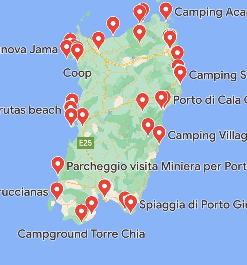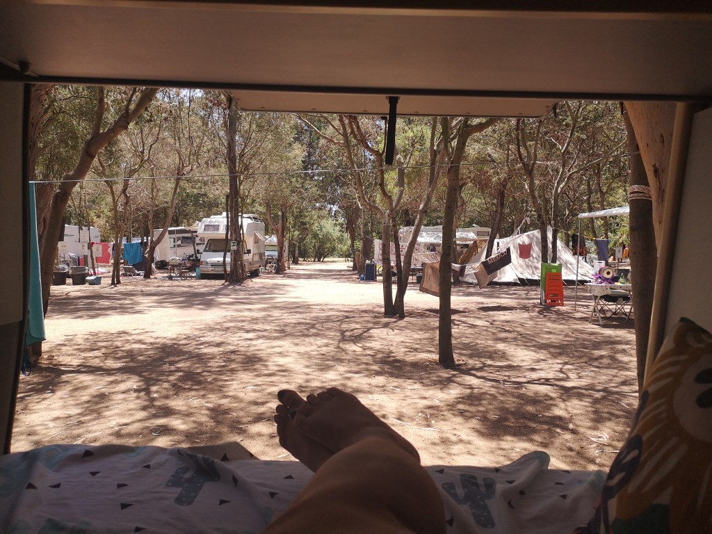 Odločili smo se za spanje v kampu Is Arutas, ki je poleg znamenite plaže z istim imenom. Kamp sicer ni ne vem kaj (z Emo sva imeli največje težave, ker v kampu ni WC školjk, ampak samo “čučavci”). Kot gostje so bili večinoma sami domačini. A osebje in tudi gostje nadomestijo vse s svojo prisrčno prijaznostjo, odprtim odnosom. Takoj smo bili eni od njih.
