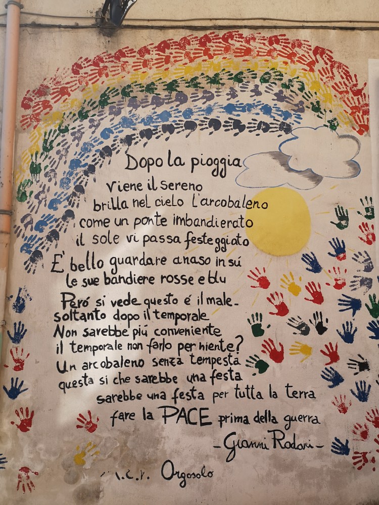 Orgosolo – mesto grafitov. Najprej sploh nisem dojela, potem pa sem začela brati napise po hišah. Govorijo o pretresljivih dogodkih, o boju za svobodo, o padlih, ker so protestirali proti fašizmu, pa o beguncih, pa o tem, da smo vsi begunci-prišleki, vsi smo od nekod prišli. Grafiti niso novi, zgodbe, ki pa jih opisujejo, pa so aktualne tudi danes. Spet in še vedno. Človek je človeku najhujši sovražnik. Kljub močnim čustvom, ki jih ti »murales« pustijo na naju z Rokom, sva oba dejala, da ima mesto čudovito pozitivno energijo. Tudi kava in rogljiček sta bila dobra.