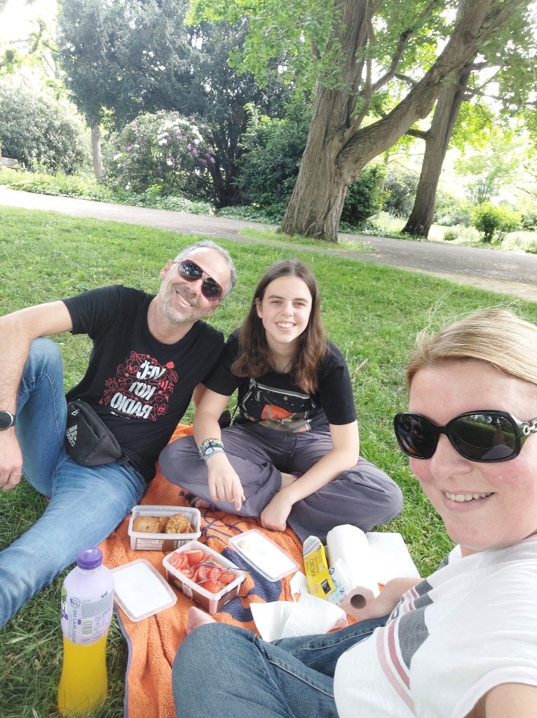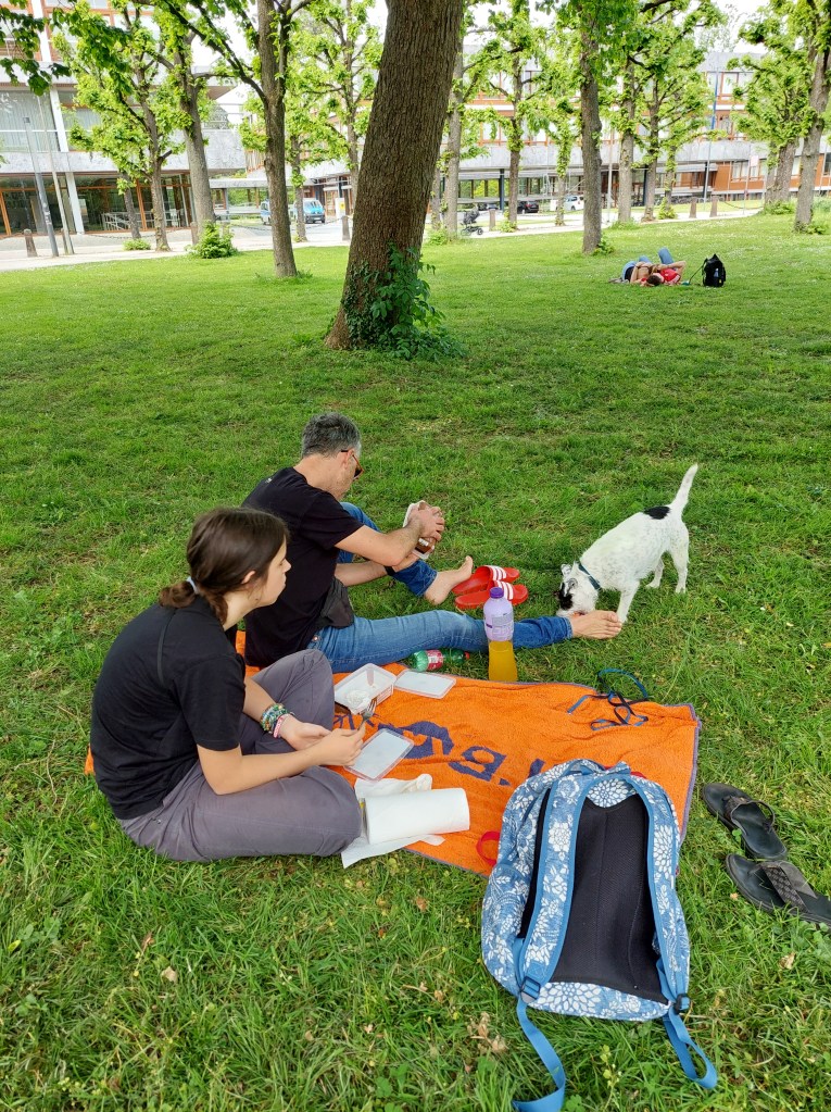 Prvi dan smo prispelo do mesta Karlsruhe, parkirali v centru in se odpravili v mestni park. Razgrnili smo deko na tla in pojedli kosilo, Tora pa je ob lovljenju žogice malo razmigala svoje tačke.