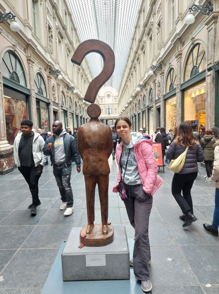 Na nasprotni strani smo zagledali znamenito galerijo Royal Saint Hubert. To je res nekaj čudovitega. Gre za notranjo pasažo, kjer so na obeh straneh čokoladnice, trgovinice, galerije z umetniškimi slikami….. vse zelo lepo, večina tudi zelo draga. Sprehodili smo se gor in dol, si ogledali galerijo s čudovito moderno umetnostjo in si za trenutek zaželeli, da bi bili bogati.