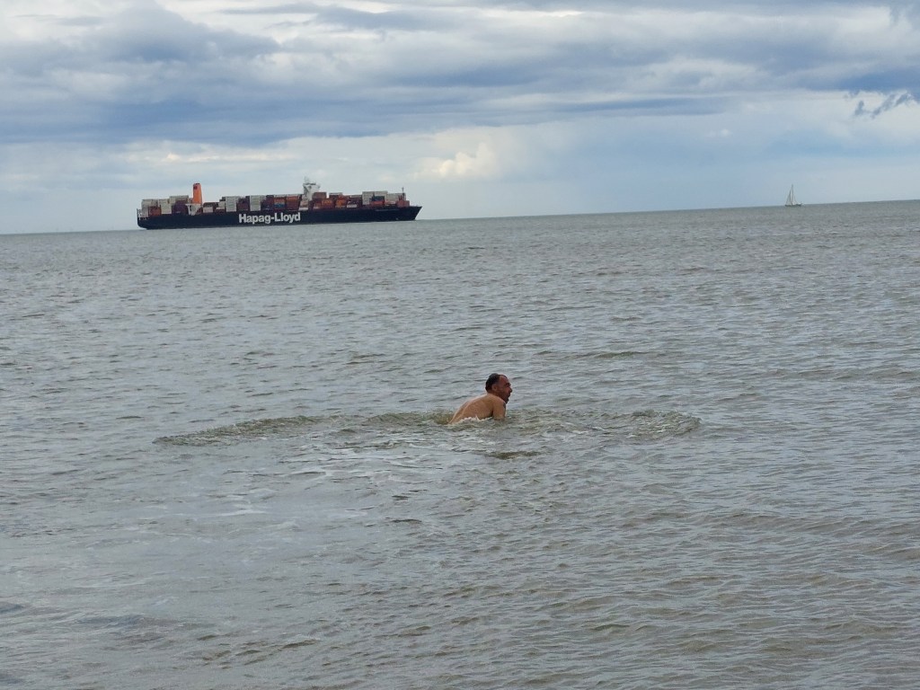 Kamp se je nahajal nižje od morske gladine, zato je pot do morja vodila čez nasip in po dolgi peščeni plaži. Okoli nas grozeči oblaki in nekaj sprehajalcev. V kopalkah smo bili edini. In tudi edini, ki smo stekli v morje in se vriskajoči potopili vanj. Ni bilo prav toplo. In prijetno je bilo ponovno skočiti v trenirke.
