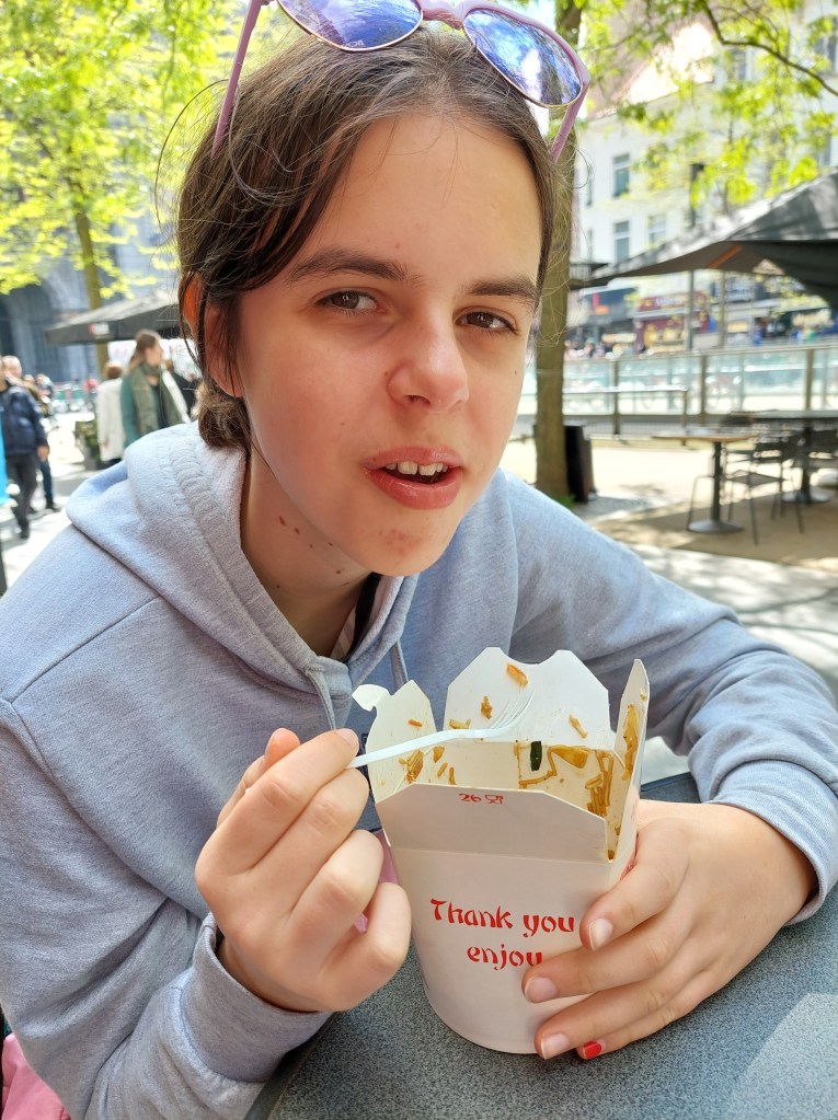 Nadaljevali smo po ulici za muzeje in si privoščili še belgijske vaflje. Dobri, a nekoliko težje jih je jesti z lesenimi vilicami, ki se hitro lomijo. Nekoliko je bilo seveda zato prisotnega smeha in iskanja vlažilnih robčkov. Na srečo čokolada ni pristala na hlačah ali majicah.