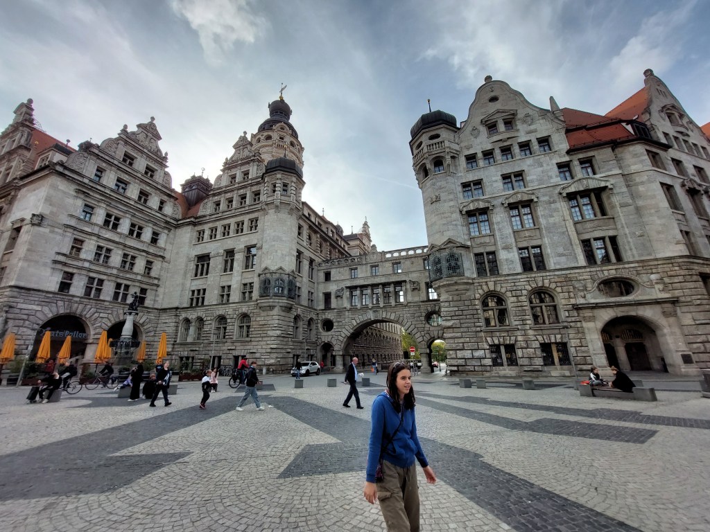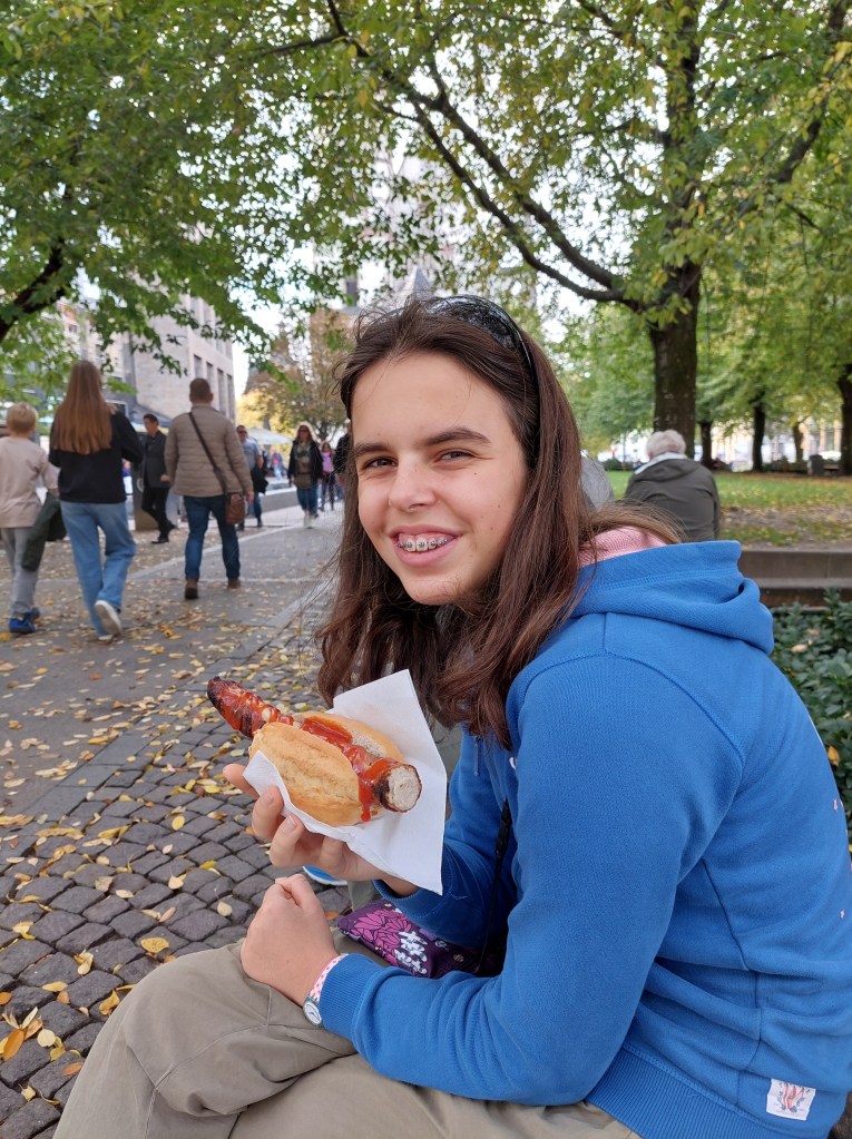 Mesto nas takoj navduši. Je čudovito, s prelepimi stavbami, malimi trgi, pasažami in parki. Na enem od manjših trgov, tik pred nekdanjo borzo, na soncu spijemo odlično kavo. Sprehodimo se mimo čudovite mestne hiše, do cerkve Sv. Tomaža, nadaljujemo po nakupovalnih ulicah do kioska s klobasami. Odlična malica.