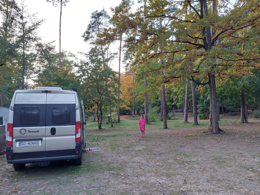 Popoldne se utrujeno odpeljemo v smeri Berlina in najdemo en kamp – Icanos (52.2772, 13.0171). En tak hecen kamp. Ob prihodu nas najprej seznanijo z nepreglednim številom različnih pravil in prepovedi, ki veljajo v kampu, povedo da imamo napačen kabel za elektriko in kje pes sme in kje ne, plavati v jezeru. Pravi kabel nam nato brezplačno posodijo. Zraven pa tudi nekoliko okregajo. Postavimo se na določeni parcelo (bili smo edini gostje kampa, če odštejem paušaliste, ki so bili na drugem koncu in le 2 prisotna v kampu). Hitro tečemo do plaže (kjer se psi ne smejo kopati), a je tam toliko ribičev, da smo šli raje na »pasjo« plažo in Rok ter Ema se vržeta v vodo. Voda naj bi imela 15 stopinj. Vsi okoli nas v bundah, kapah in šalih, mi pa v brisačkah/kopalnih plaščih. Hitro pod topel tuš, skuhamo večerjo in pademo v postelje.