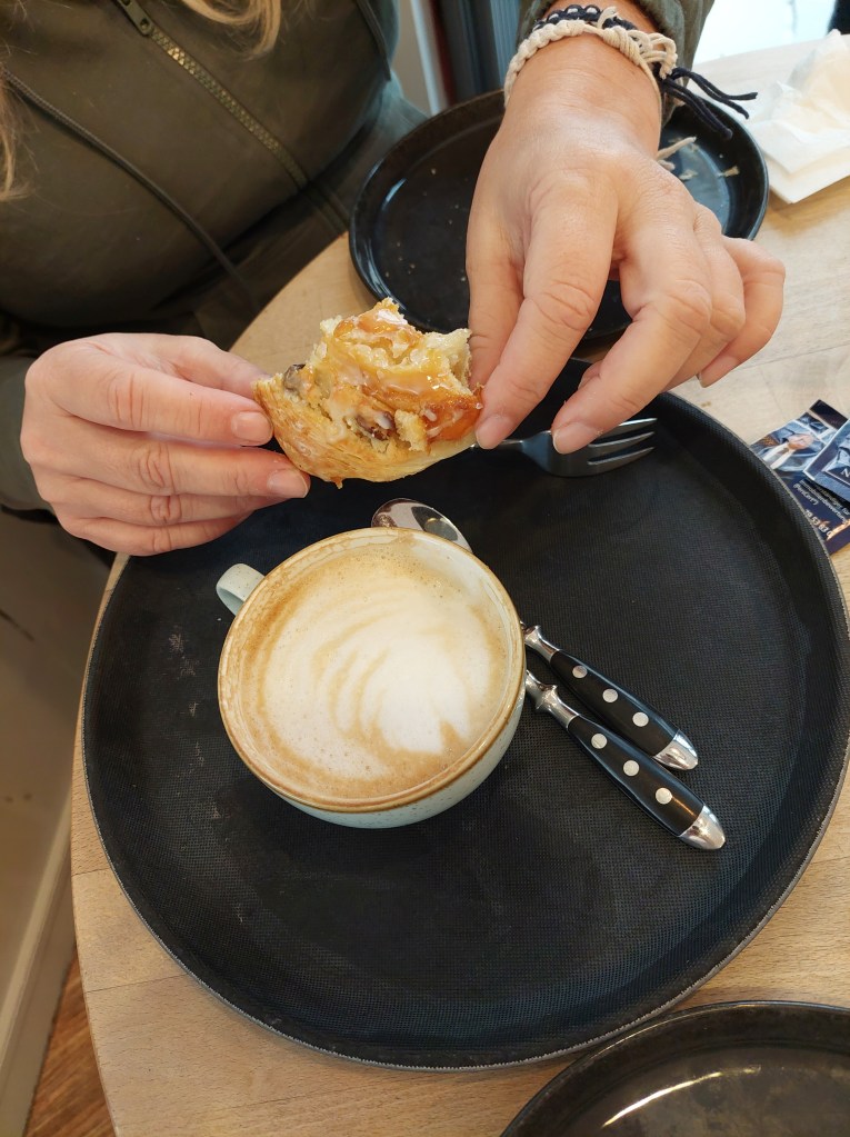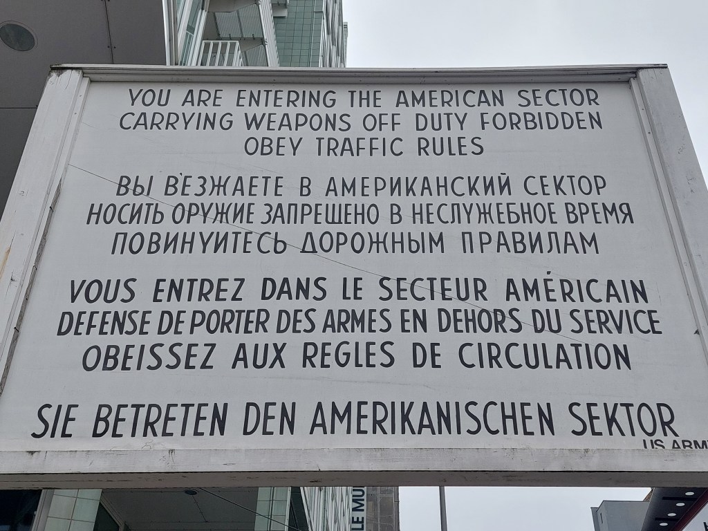Naslednji cilj je bil Checkpoint Charlie, ki je bil kar nekaj hoje oddaljen, a je Rok vztrajal, da začnimo peš in morda nato sedemo na javni prevoz. Žal pa sem nas vodila po poteh, kjer javnega prevoza ni bilo in pot se je vlekla v nedogled. Na koncu smo hodili že 1h in bili totalno naveličani vsega, utrujeni in tečni. Zadnji kilometer smo se odpeljali z avtobusom in najprej zavili v kavarno na malico in dobro kavo. To je bila odlična ideja. Ne samo, da so bili sendviči in kava odlični, moč za nadaljevanje ogleda mesta, se je vrnila.