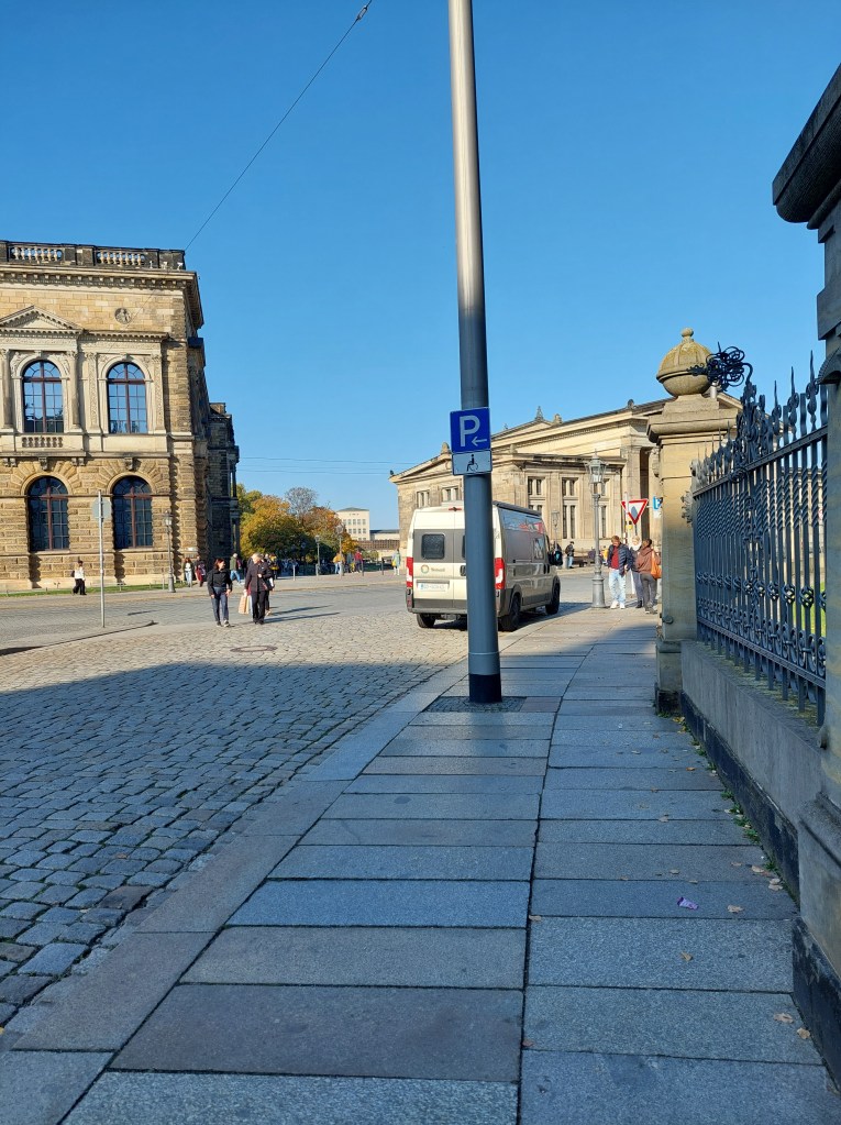 Parkiramo na tako norem mestu, da sploh nismo mogli verjeti, da je dovoljeno – čisto nasproti Zwingerja in Semperopere. Tam okoli je namreč nekaj parkirnih mest rezerviranih za invalide. Bili pa smo tako zgodnji, da smo komaj našli kavarno, ki je bila odprta. Privoščili smo si namreč odličen zajtrk – jajca s paradižnikom/slanino in dobro kavo.