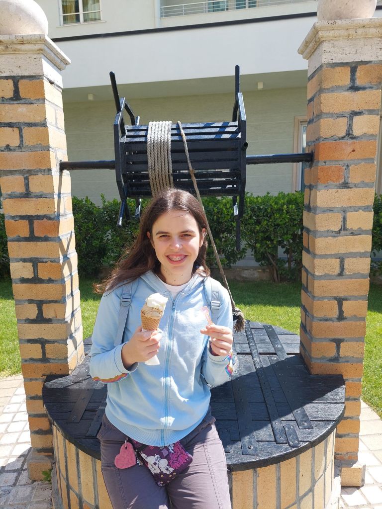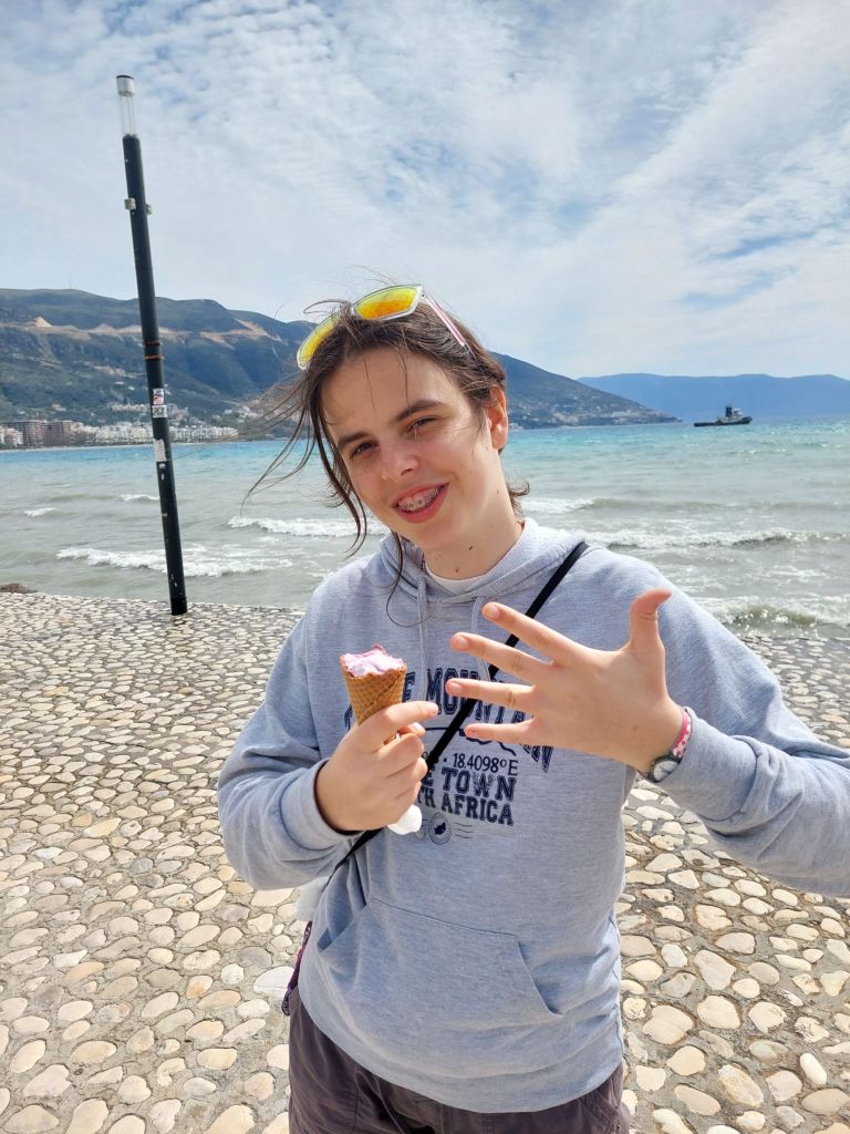Na obali zapuščeni barvni čolnički in v daljavi velike tovorne ladje. Drač je namreč zelo veliko pristanišče. V Albaniji se je sladoled! In prvega je Ema pojedla že na promenadi.