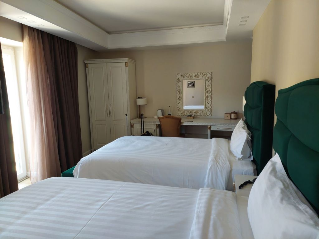 Nato se vrnemo v hotel po prtljago, kjer izveva, da je v hotelu premalo sob na voljo in naju (ter še nekaj ostalih) prosijo, če bi bili pripravljeni oditi v drug hotel. Seveda sprejmeva, saj sva ugotovili, da so nam ponudili butični hotel takoj za obzidjem, v starem delu mesta in z dobro oceno na Bookingu. Soba je čudovita, z 2 malima balkončkoma in ogromnima udobnima posteljama.