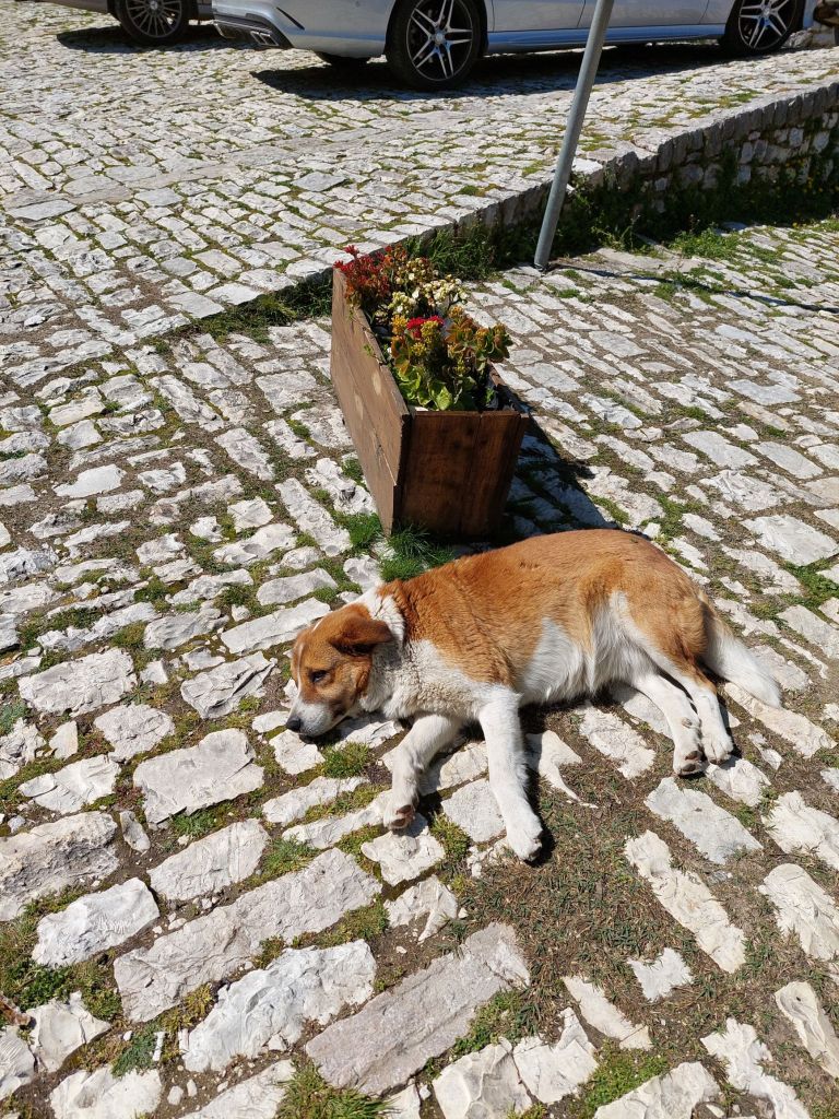 Posebno pozornost pa sva z Emo na tem potovanju namenili Albanskim kužletkom. Tam je namreč ogromno prostoživečih psov. Eni so čipirani (imajo oznake v ušeskih), eni žal ne. Videvali sva tako mladičke, kot starejše pse. Vsi so bili zelo prijazni. Večino časa itak spijo. Kolikor se je dalo, sva jih poslikali in tu so njihove fotke – v spomin na Albanske kužletke: